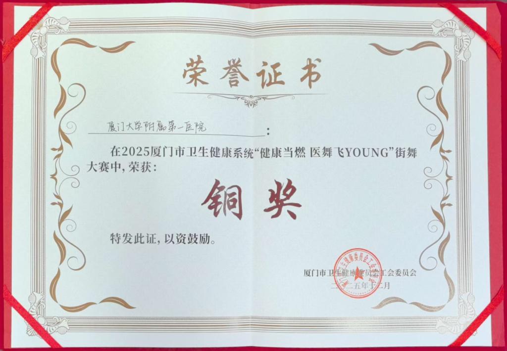 医院始终坚持“以人为本”的发展理念,鼓励职工在精湛医术之外,拓展多元兴趣,实现全面发展。铜奖这份荣誉不仅是对队员们近两个月来刻苦排练与艺术创造力的肯定,更是厦门大学附属第一医院注重人文关怀、聚力团队建设、培育全面发展的医院文化的生动体现。未来,医院将继续搭建各类文体平台,营造积极向上、团结和谐的执业环境,激励全体职工以更饱满的激情、更昂扬的姿态,携手执守护佑健康之翼,为厦门市卫生健康事业的高质量发展贡献更大力量。