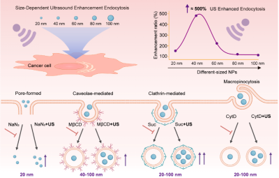 实验结果显示:超声能显著增强20至80 nm尺寸范围内纳米颗粒的细胞内吞效率,且效果呈现出强烈的尺寸依赖性。其中,40 nm的颗粒在超声作用下内吞效率提升了3.8倍,表现出最优的超声响应性能。进一步的机制研究证明了超声的双重作用:不仅可以通过“声孔效应”为纳米颗粒打开非能量依赖性的“快速通道”;更重要的是能够“解锁”并激活细胞自身的多种内吞途径,甚至逆转小窝蛋白、网格蛋白等多种内吞抑制剂的“封锁”作用,从而大幅提升纳米颗粒的入胞效率。该研究首次系统阐明了纳米颗粒尺寸在超声增强内吞过程中的核心地位,并揭示了超声通过激活多种内吞途径协同“声孔效应”促进药物入胞的双重机制。相关发现为设计具有尺寸可控与超声响应性能的下一代药物递送系统提供了数据支撑和理论指导。