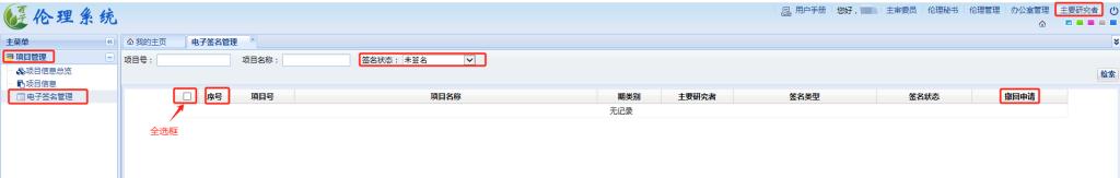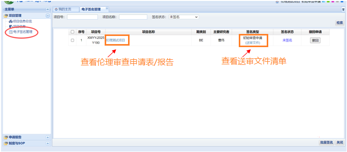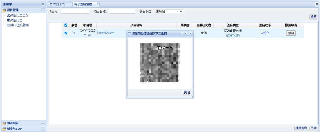 申请人/主要研究者使用其账号密码登录伦理系统,网址:https://www.xddyec.com:90/, 选择“主要研究者”界面,“主要研究者”界面左侧主菜单“项目管理——电子签名管理” ,勾选需要提交的项目,点击“批量签名”,系统会弹出二维码,使用绑定申请人/主要研究者电子签名手机号的微信扫码,完成电子签名。“序号”左边的方框是全选框,点击每个项目的“项目名称”可以查看伦理审查申请表/报告表,点击每个项目的“送审文件”可以查看送审文件清单。若认为待电子签名的项目文件需要修改、完善后重新提交,需要点击“撤回”。