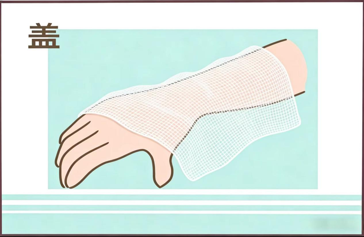 【盖】 用清洁纱布/保鲜膜轻轻覆盖创面 (保护防感染)