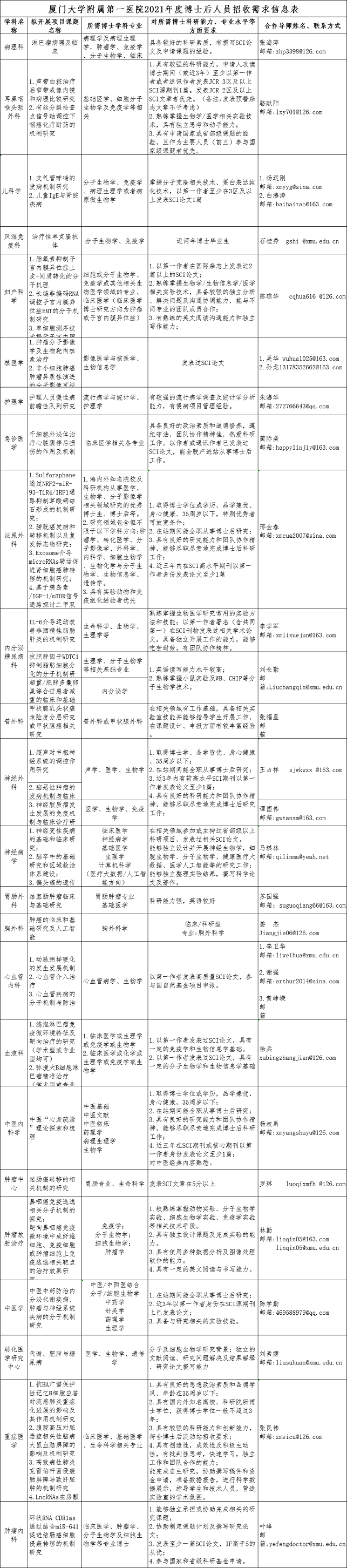 附件:厦门大学附属第一医院2021年度博士后人员招收需求信息表.xlsx