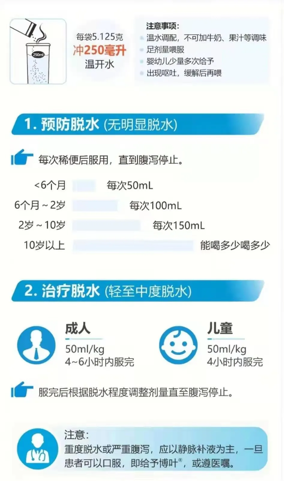 重点提示:口服补液盐一定要按比例配置,不能够随意加水,但是可以分次口服。