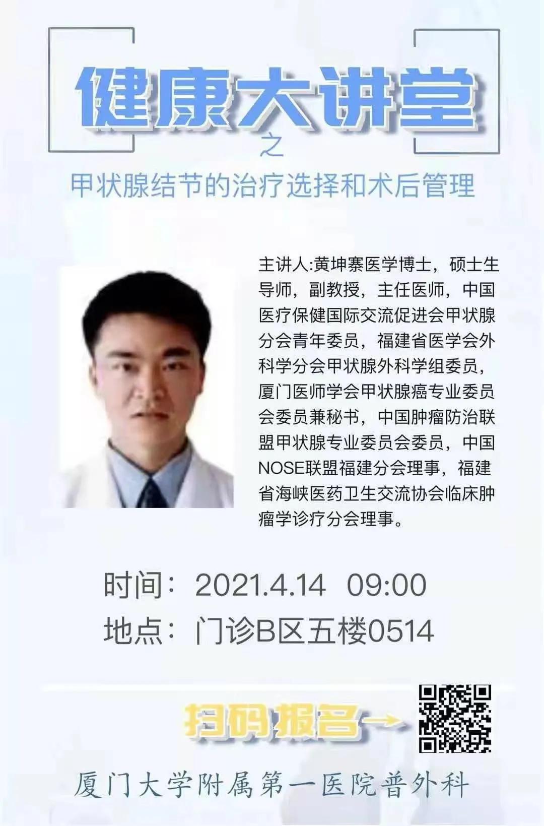 为庆祝建党一百周年,普外科支部举办健康大讲堂!于4月14日开讲第一堂课,为更多甲状腺结节及甲状腺癌患者授课及现场咨询,为术后患者指导饮食及注意事项!对甲状腺疾病有疑问的朋友,请扫描二维码,让专家为您答疑解惑哦!