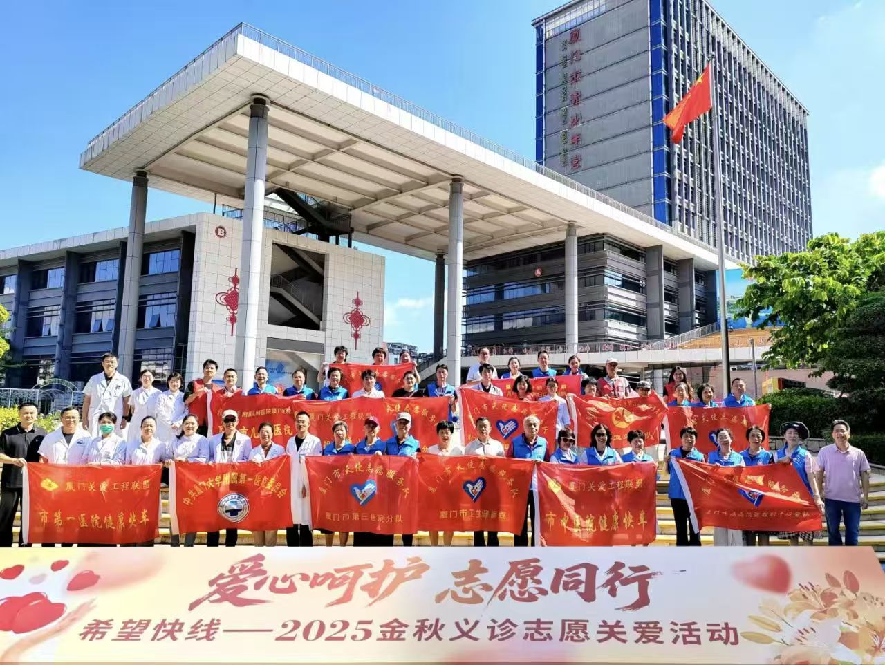 2025年10月18日上午,第一医院组织老专家志愿者及在职医护志愿者,参加由市关工委、市卫健委、市青少宫组织的在市青少宫的“金秋义诊”活动。市关工委胡家榕副主任、市卫健委许龙副主任等领导看望慰问现场义诊专家志愿者。