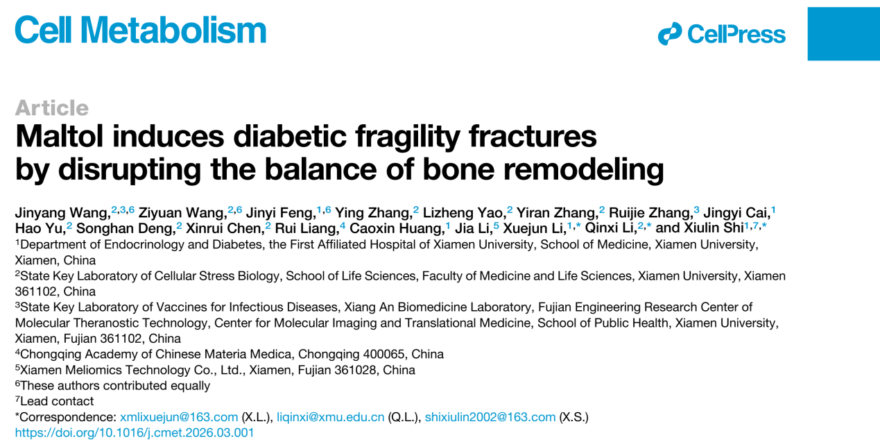 近日,厦门大学附属第一医院石秀林主任、李学军主任团队联合厦门大学生命科学学院李勤喜教授团队,在国际顶级代谢学期刊 Cell Metabolism(IF=30.9)在线发表题为“Maltol Induces Diabetic Fragility Fractures by Disrupting the Balance of Bone Remodeling”的重要研究成果,首次揭示常用食品添加剂麦芽酚是糖尿病患者骨骼脆性增加的可调控风险因素,为糖尿病性脆性骨折的防治及食品添加剂安全评估提供了全新思路。