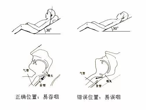 吞咽时通过头颈等部位的姿势调整,可使吞咽通道的走向、腔径大小和某些吞咽器官组成结构的位置有所改变和移动避免误吸和残留,消除呛咳等症状。一般认为进食最佳体位为坐位或半卧位,进食体位一般采取躯干与地面成30°以上角度最安全。