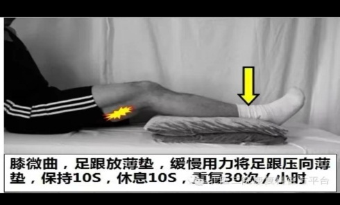 ·方法:膝微屈,足跟放薄垫,缓慢用力将足跟压向薄垫,保持10秒,做10个;